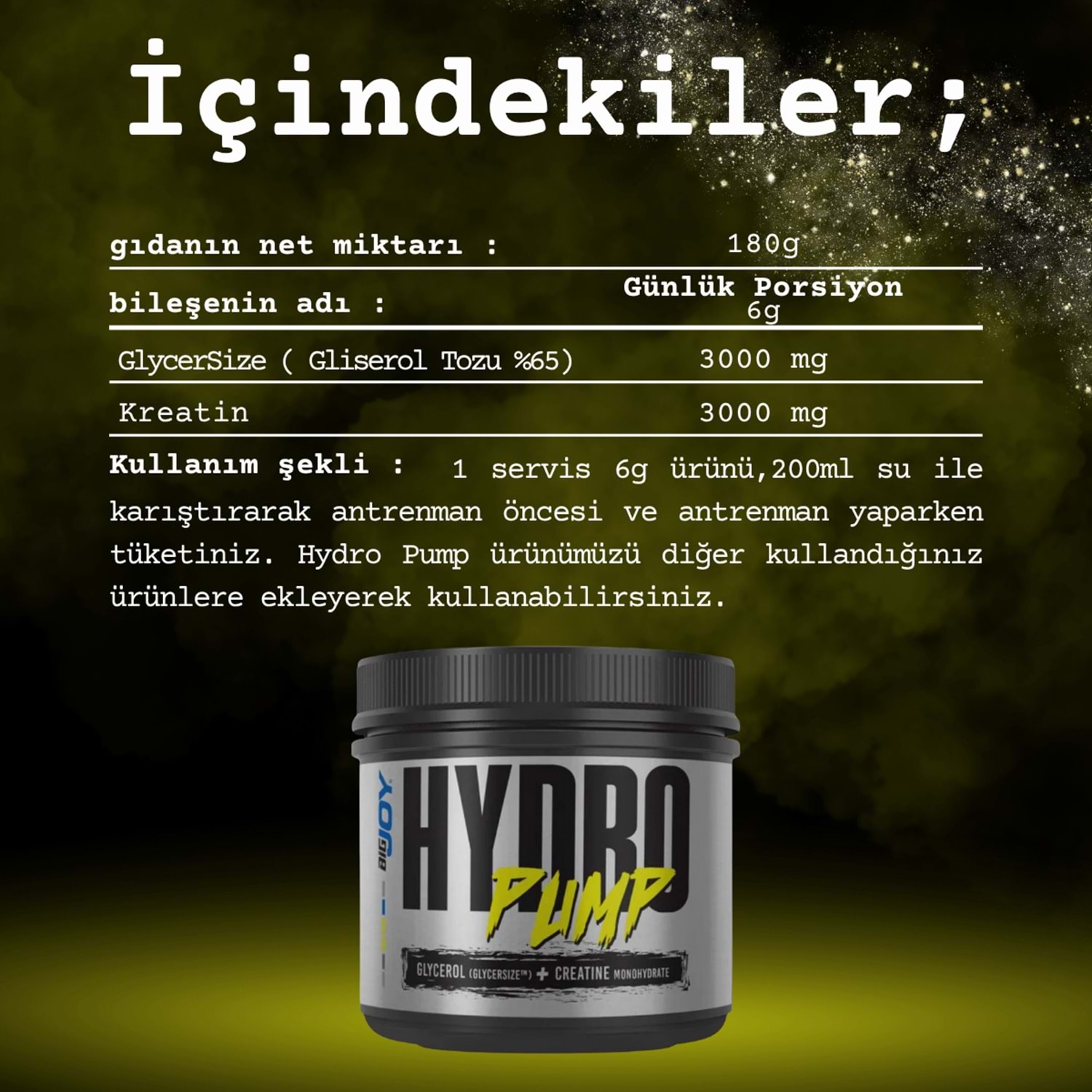 Kullanım Bilgisi: 1 servis yaklaşık 6g ürünü, 100-200ml su ile karıştırarak antrenman öncesi ve antrenman yaparken tüketiniz. Hydro Pump ürünümüzü diğer kullandığınız ürünlere ekleyerek kullanabilirsiniz.