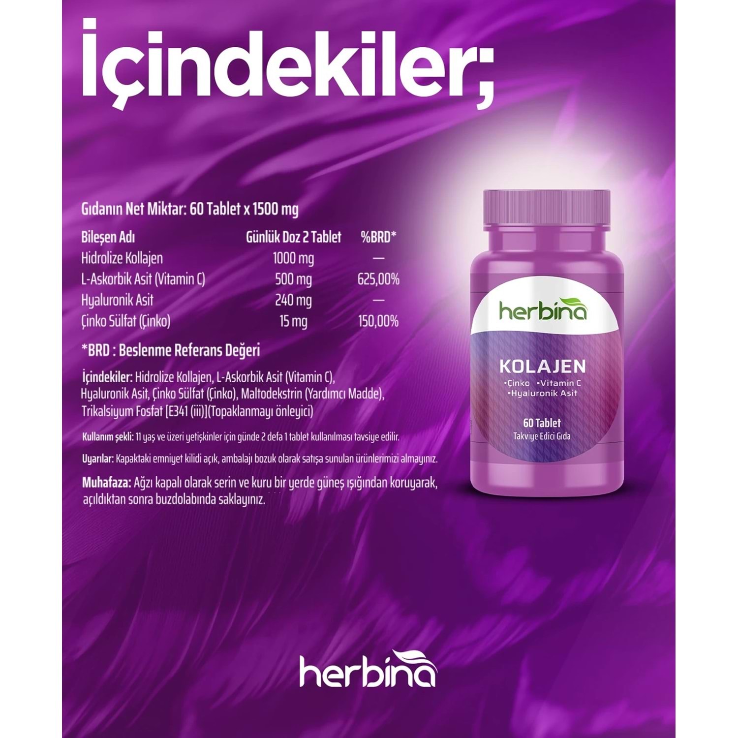 HERBİNA Kolajen Hyaluronik Asit Vitamin C 60 Tablet